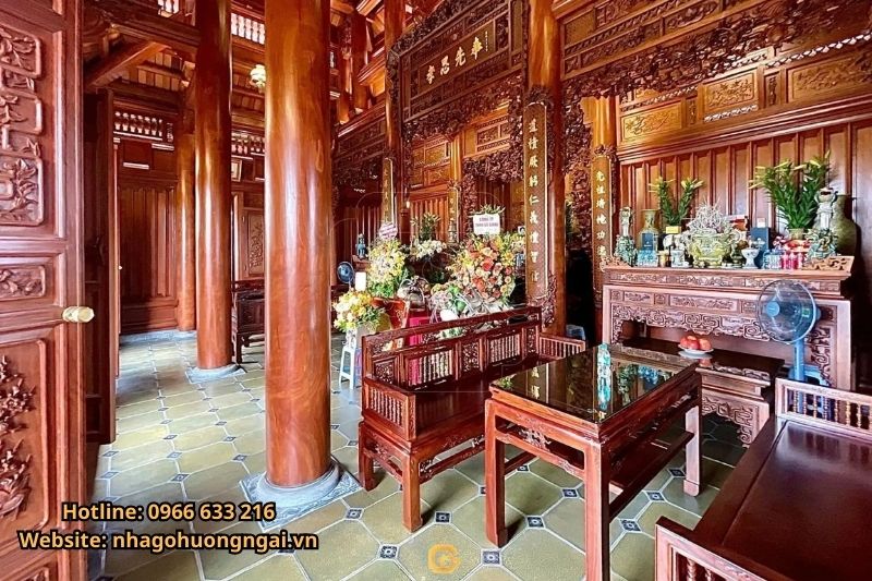 Đây là khu vực quan trọng nhất, với bàn thờ lớn bằng gỗ chạm khắc tinh tế, hoành phi câu đối thể hiện sự tôn kính đối với tổ tiên. Phía trước bàn thờ thường có sập gụ hoặc bộ trường kỷ để thuận tiện cho việc cúng bái. Ngoài ra, có thể trang trí thêm đèn lồng, câu đối gỗ hoặc tranh phong thủy để tăng thêm vẻ trang nghiêm.