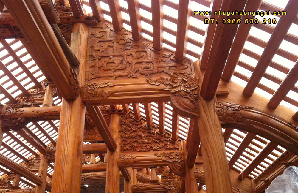 - Hệ thống cột kèo chắc chắn: Sử dụng kỹ thuật chạm trổ tinh xảo, hệ thống cột kèo không chỉ mang lại sự vững chắc mà còn là yếu tố thẩm mỹ nổi bật.
