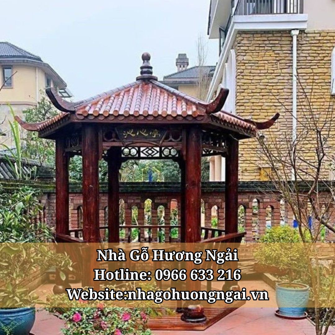 Chòi lục giác luôn gây ấn tượng bởi hình khối khác biệt. Bố trí sàn nâng khoảng 20–30 cm so với nền vườn: